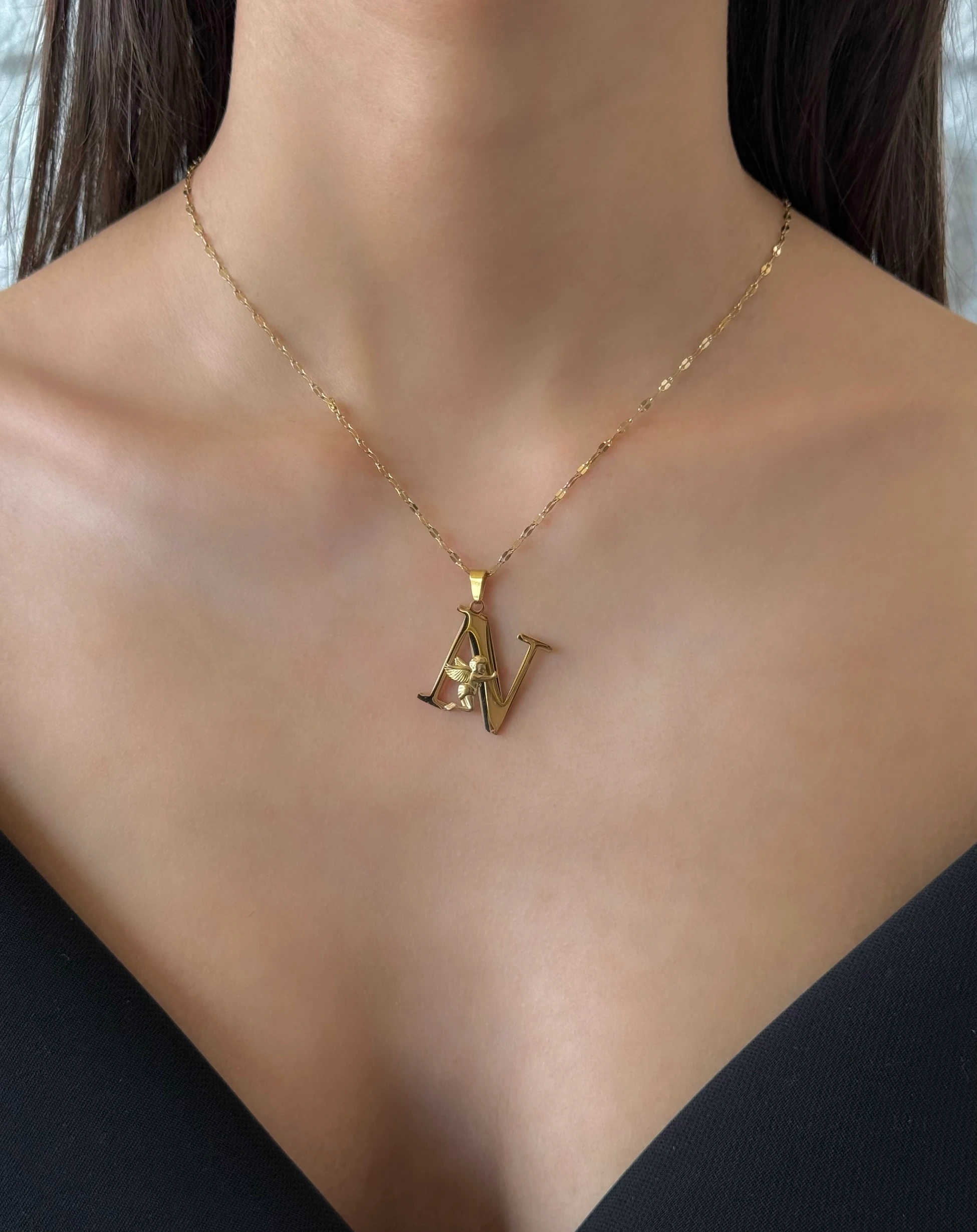 Çelik Melek Detaylı N Harfli Kolye