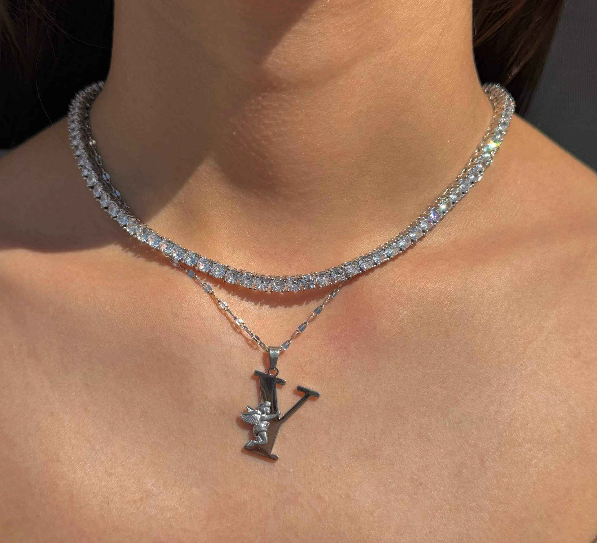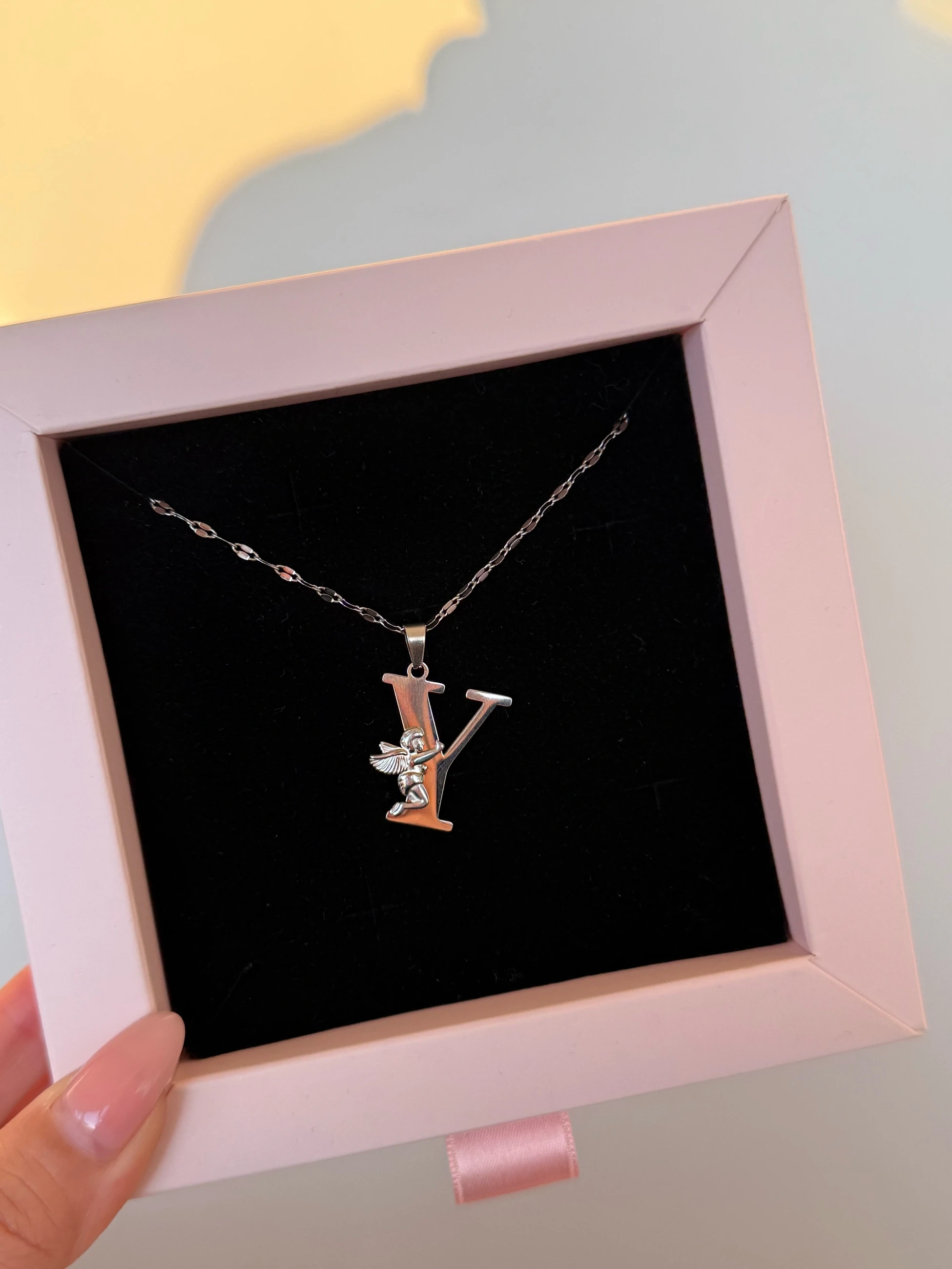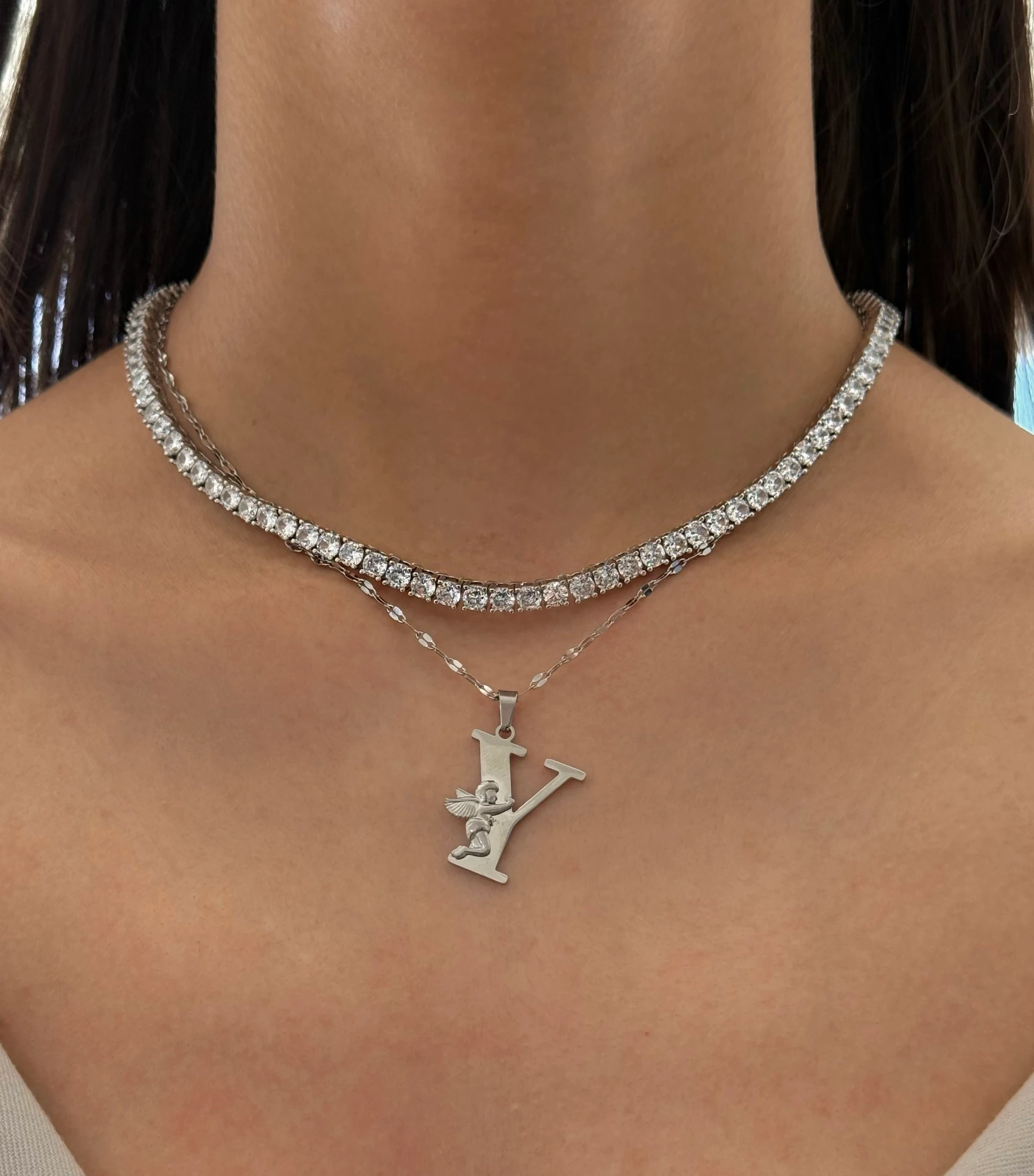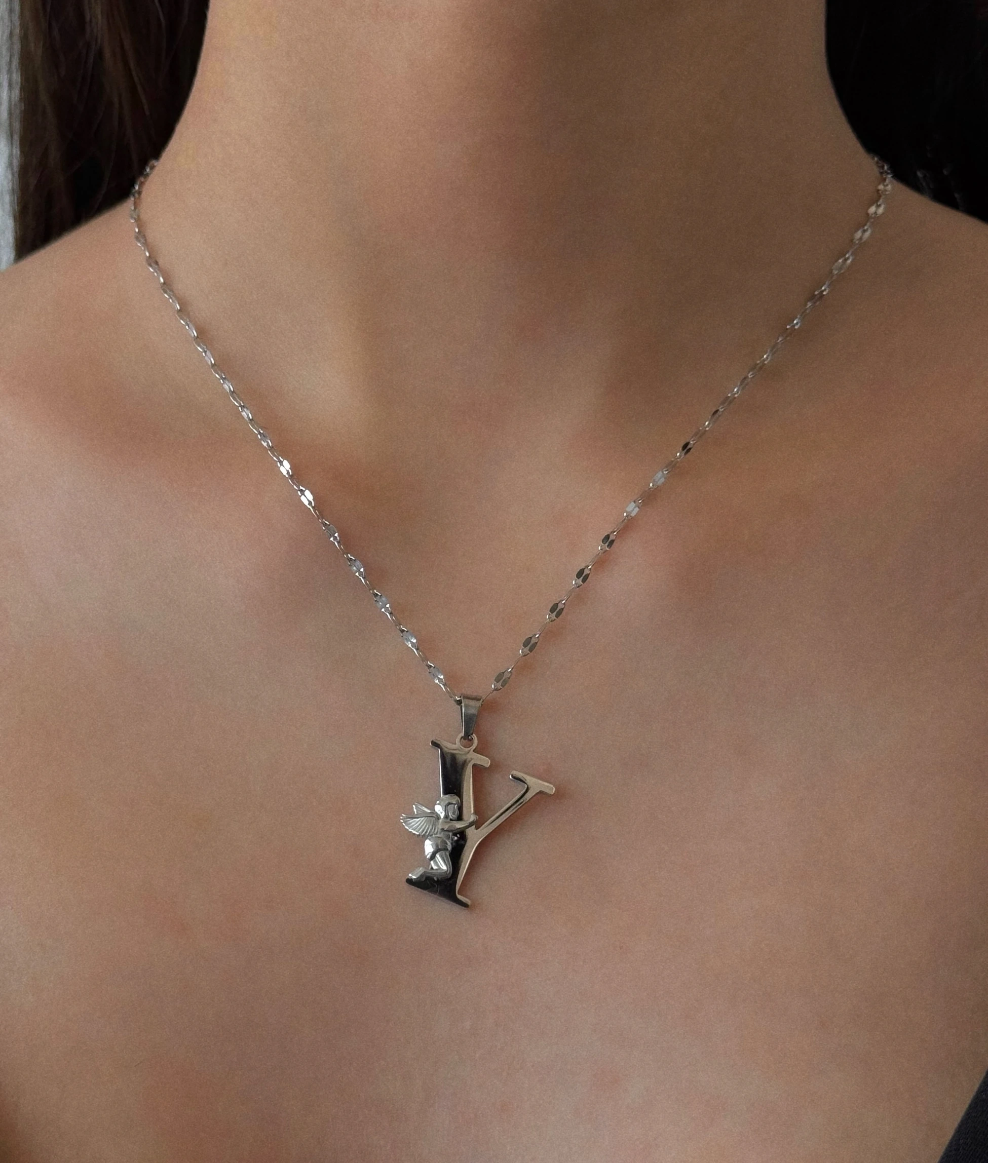 Çelik Melek Detaylı Silver Y Harfli Kolye