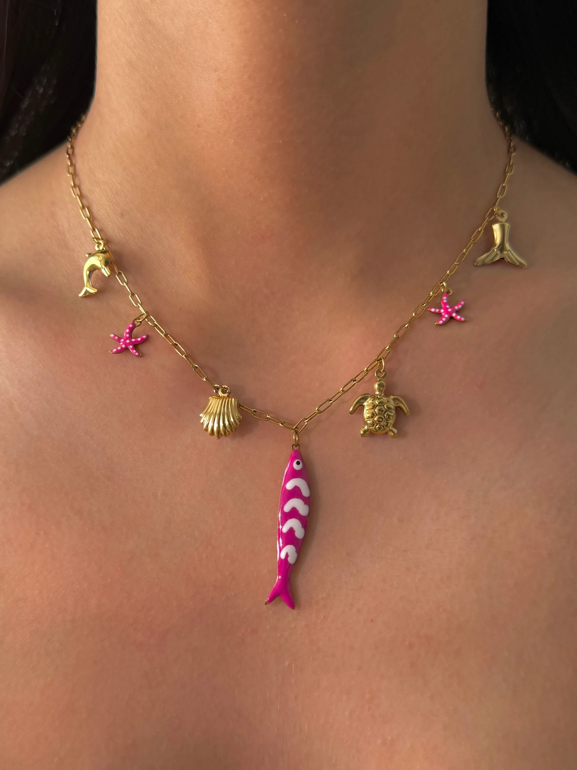 Çelik Pembe Balık Detay 7 Charmlı Kolye